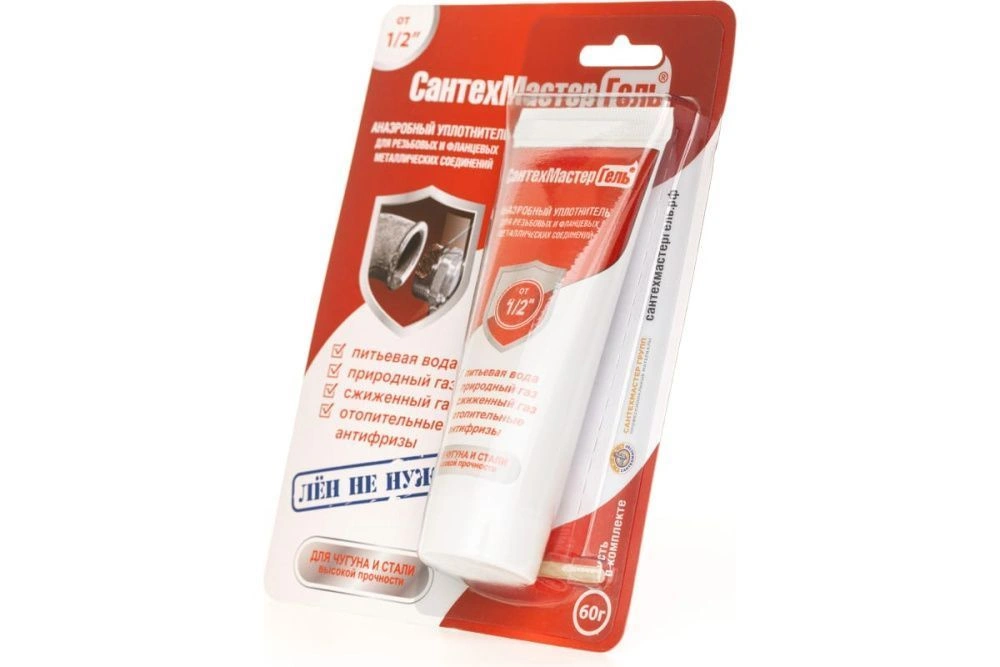 Гель Сантехмастер прост в применении – он легко наносится на резьбовое соединение и обеспечивает быстрое затвердевание при отсутствии доступа к воздуху (анаэробное условие). Упаковка геля представлена в тубе с блистерной упаковкой, что обеспечивает удобство хранения и применения продукта. Объем тубы составляет 60 грамм, что обеспечивает достаточное количество продукта для обработки нескольких резьбовых соединений.