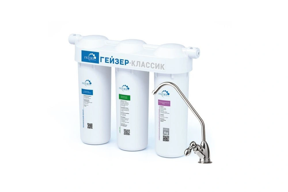 Гейзер Классик имеет три ступени очистки. Обеспечивает очищение воды от тяжелых металлов, железа марганца, солей жесткости, хлора и органических примесей. В фильтре используется классическая для компании схема очистки с картриджем. Замена картриджей для семьи из 3-4 человек в среднем 1 раз в год.